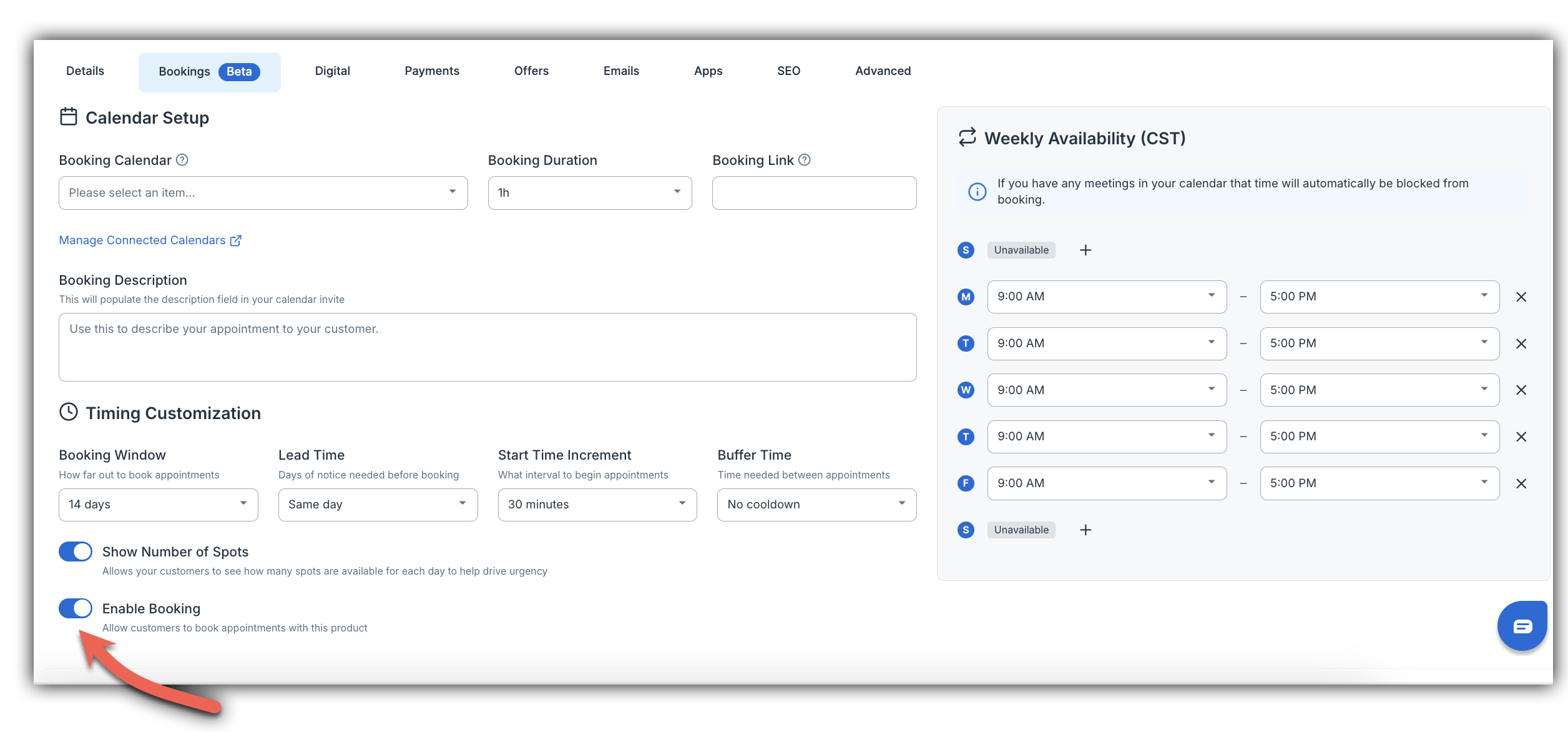 In the Bookings tab, toggle Enable Booking to ON. This makes appointment selection a required step for customers purchasing this product.