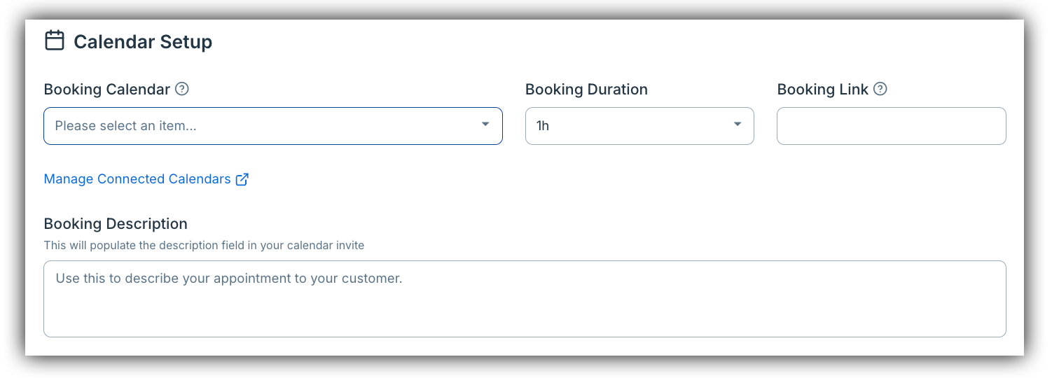 - Booking Description — write what will appear in the calendar invite sent to your customer (e.g., "Thank you for booking! I'm looking forward to our consultation. Please have your questions ready.")