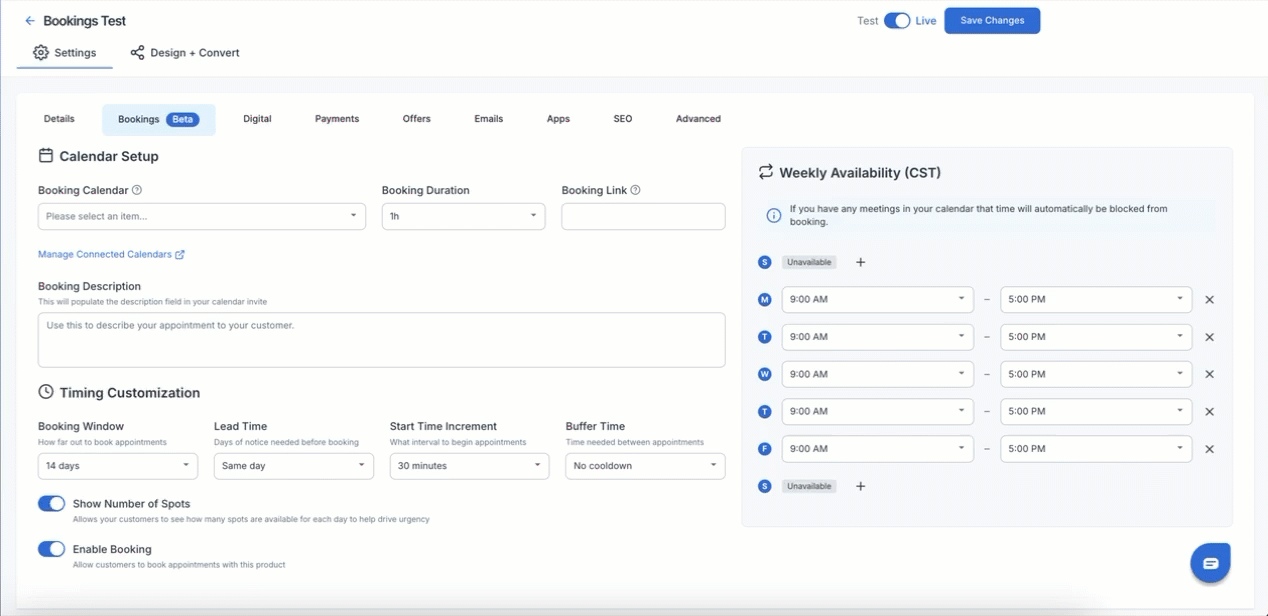 Updating Your Availability: To change your available hours going forward, navigate to your product's Bookings tab, update your Weekly Availability, and click Save Changes. This only affects future bookings — existing appointments are not impacted.
