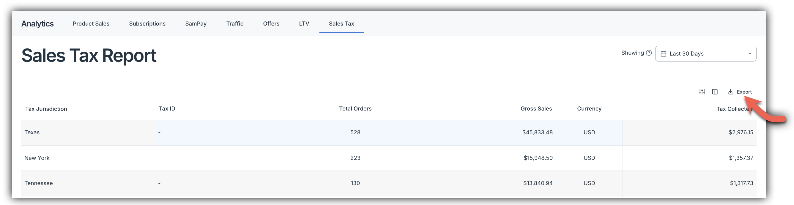 The Sales Tax Report displays your tax collected grouped by jurisdiction (nexus). For each jurisdiction, you'll see: