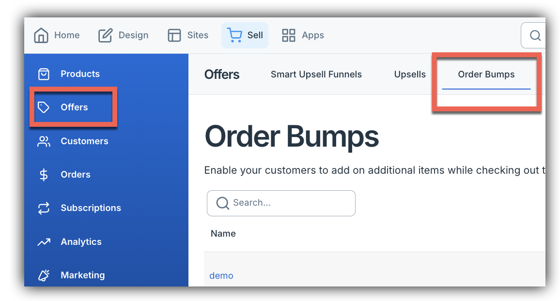 Navigate to Offers > Order Bumps in your left-hand navigation bar.