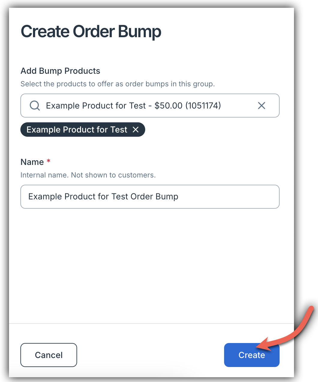 Start by selecting the product this bump will promote. Choose a Name for this Order Bump and then click Create.