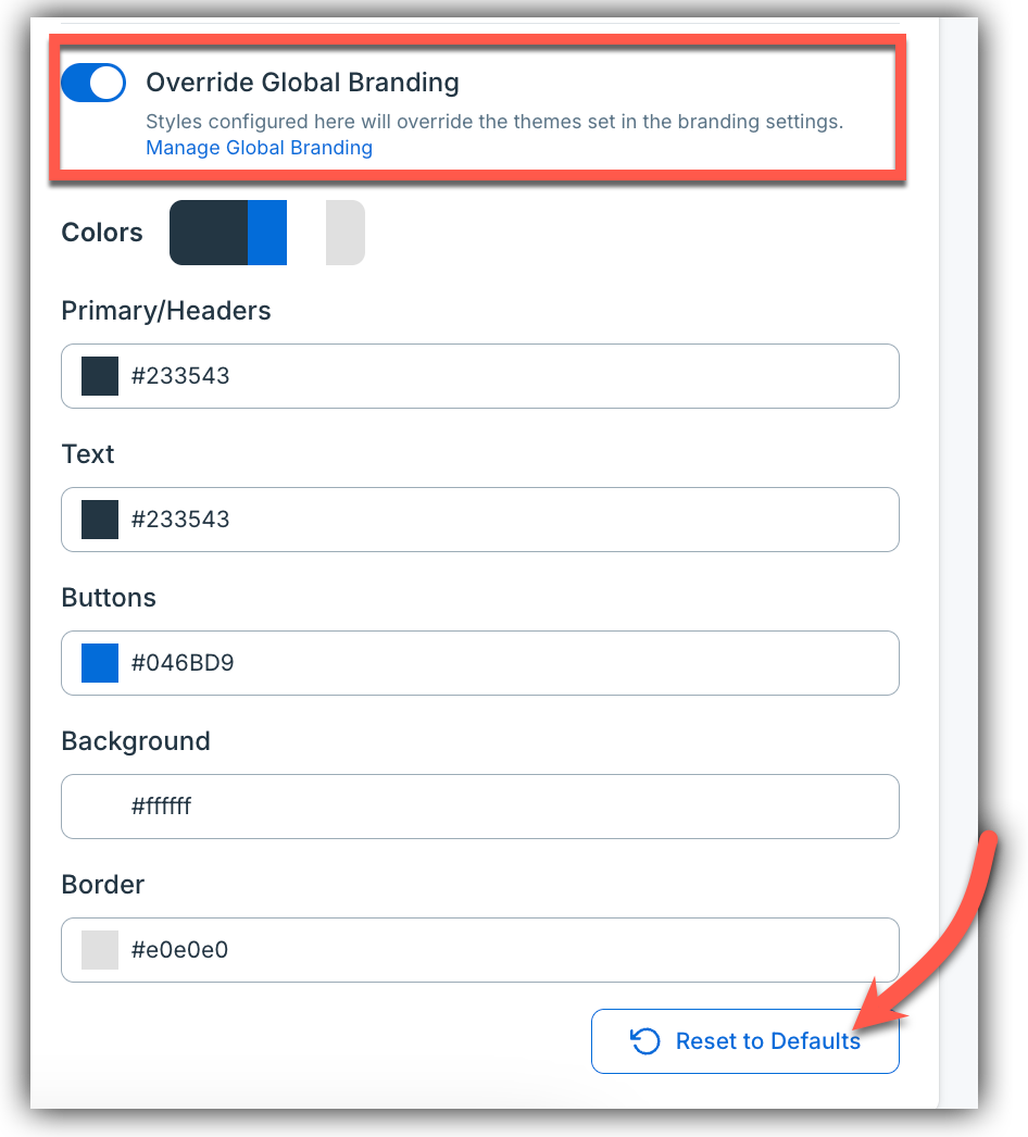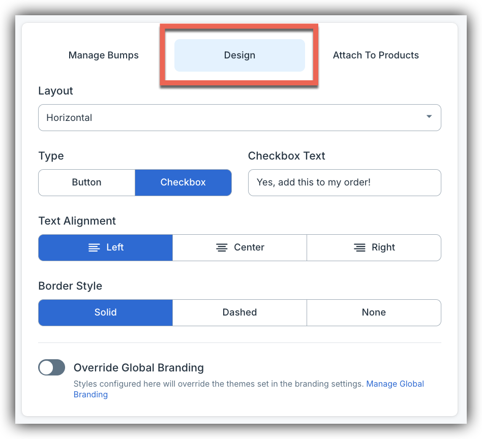 - Override Global Branding - By default, your bump inherits colors from your marketplace's branding settings. Toggle on Override Global Branding to apply custom colors specific to this bump. To update your global branding, click the Manage Global Branding link.