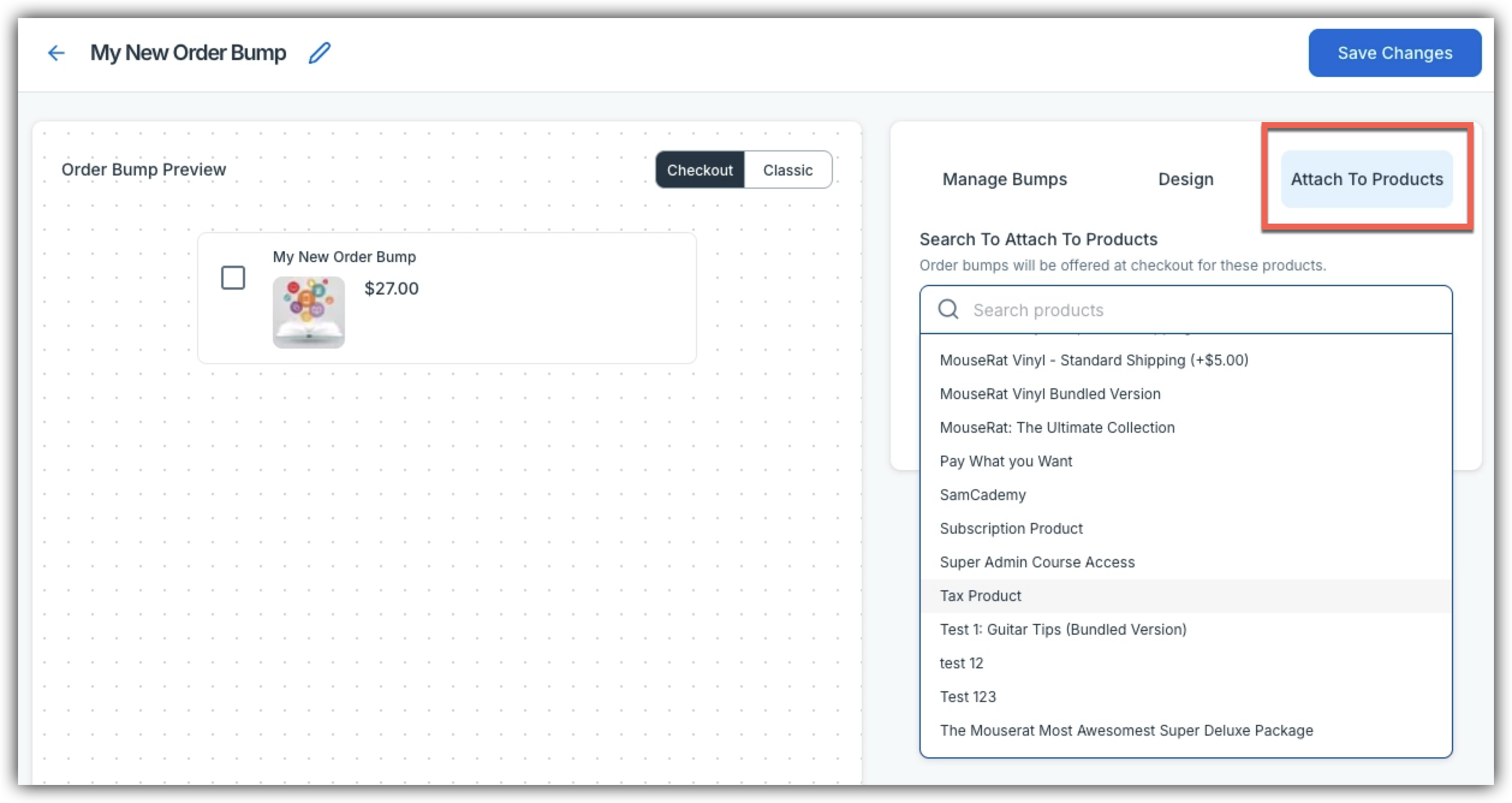 Once your order bump is saved, you can attach it to one product or many. From the order bump's edit view, click Attach to Products.