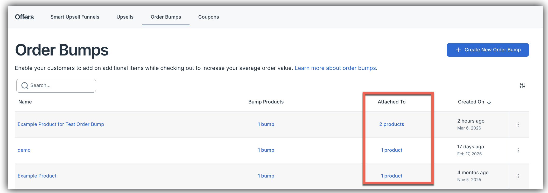 All of your order bumps are visible from Offers > Order Bumps. Each bump shows how many products it's currently attached to, so you can see at a glance where an order bump is in use.