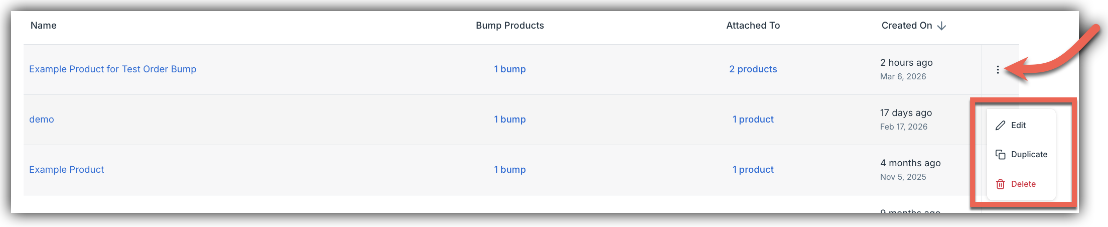 From this view you can edit, duplicate, or delete any order bump, and bulk-attach or detach products from any order bump's edit view.