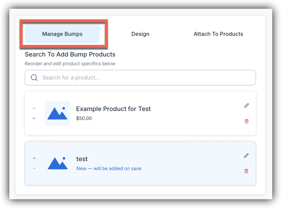 From the Manage Bumps tab, you can search for and add the product you want to promote as an order bump.