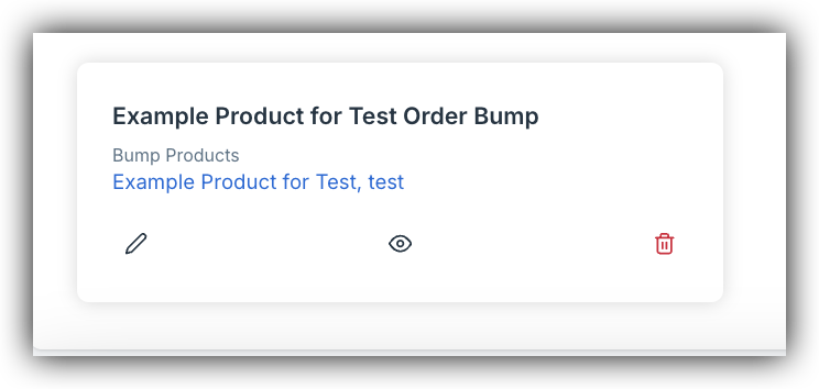 Once a bump has been attached, it will appear as a card in the Order Bumps section showing the bump name and the products associated with it.