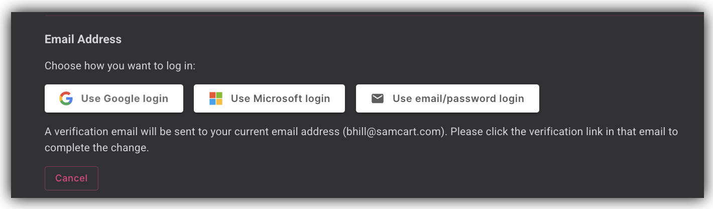 Note: If you are switching between a social login (Google or Microsoft) and email/password login — and your email address is staying the same — no confirmation email is required. The change will take effect immediately.