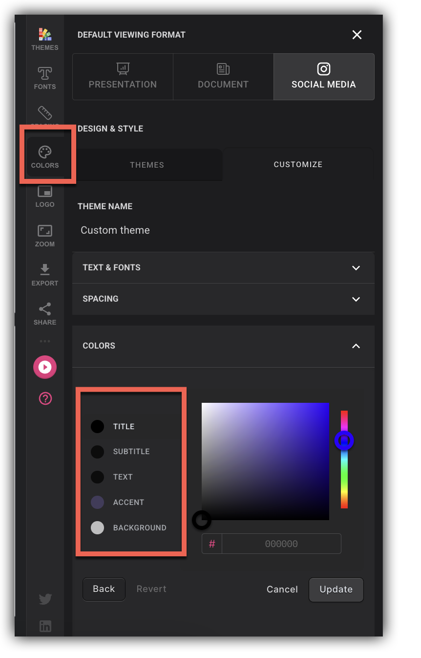 You can choose either Title, Subtitle, Text, Accent, Background. Each will update a specific color on your document.
