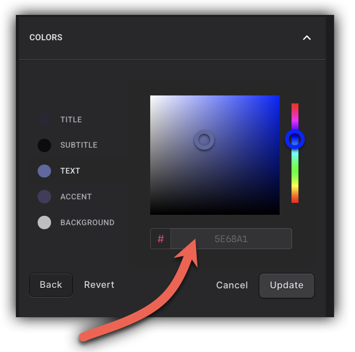 A color picker will appear. Enter a hex code, set RGB values, or use the point-to-color tool to pick any color from your screen.