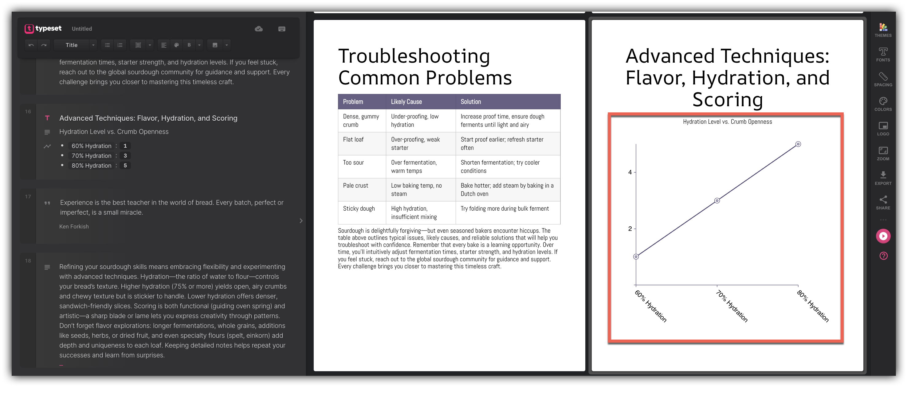 Every chart generated by Coauthor is a standard Typeset component, so you can edit it just like anything else you'd build manually. Click on the chart to select it, then make any adjustments you need — including data values, colors, labels, and layout.