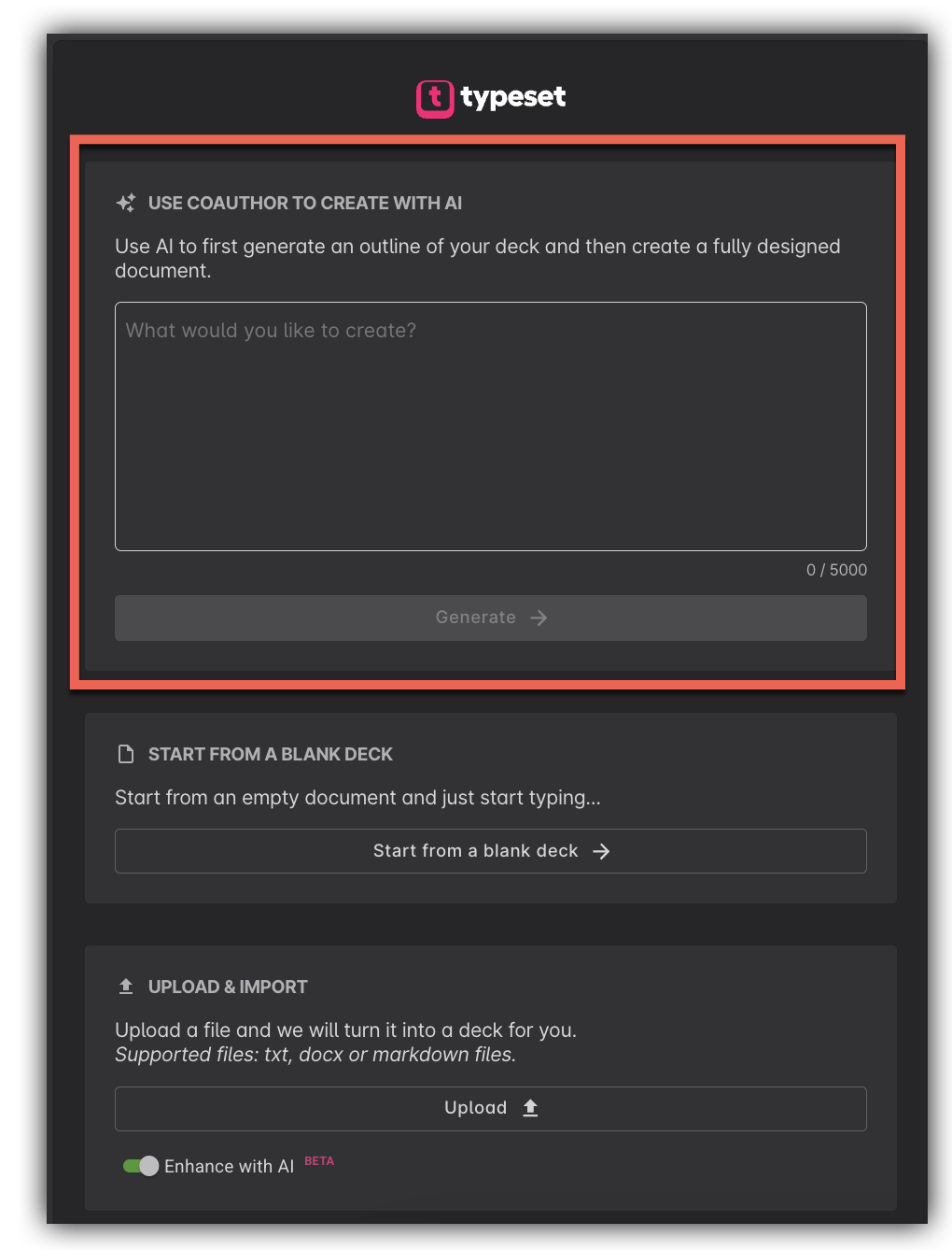 To get started, open any presentation, ebook, or site in Typeset and launch Coauthor from the toolbar.