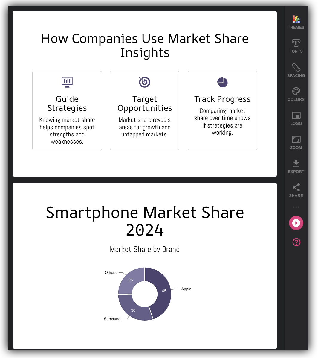 A: Chart generation is available in presentations, ebooks, and sites. AI authoring for pages is currently in beta, so you may experience some limitations there.